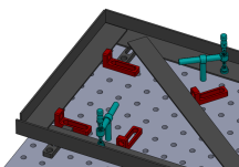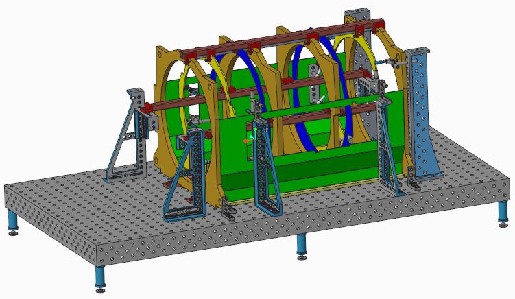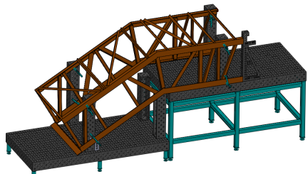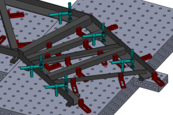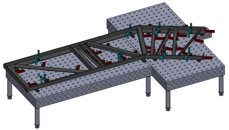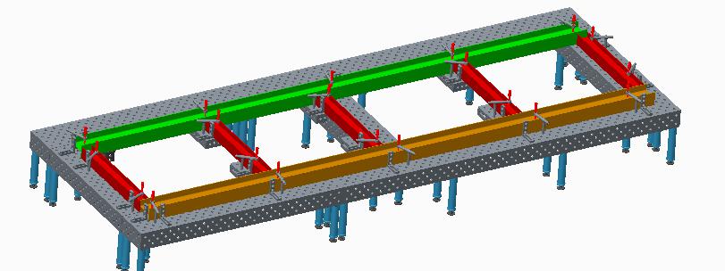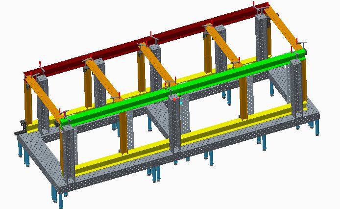 1、用三维孔系平台两张横竖拼接,将工序1—6依次分序焊接完成,以定位件定位基准,压紧装置固定产品。保证产品组装后精度要求。