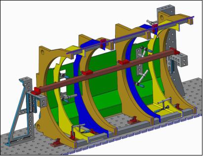 所有U箱单一尺寸有所保障,拼接后的尺寸均在技术参数内,产品的一致性和稳定性有保障。以U箱为基础支撑件,定位框架控制产品尺寸精度,用档块定位产品基准,压紧装置固定产品,使产品装夹在公差范围内。