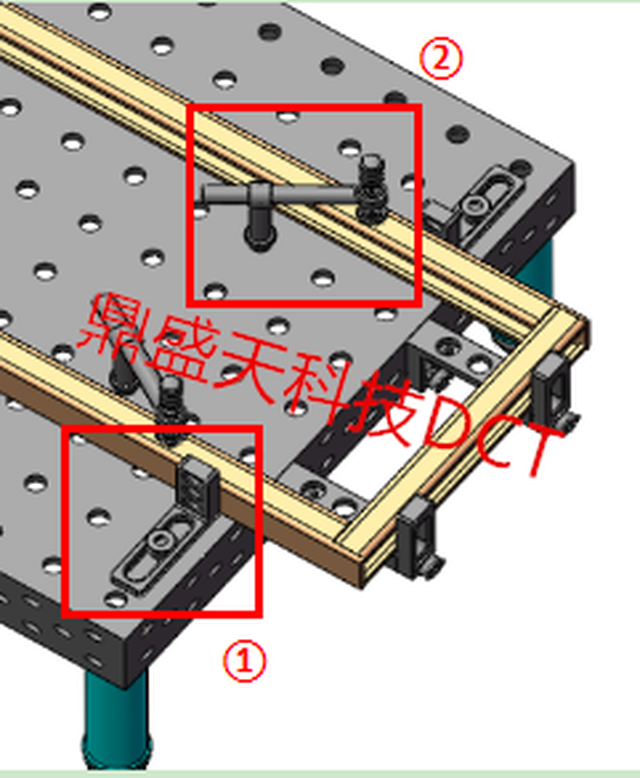 图中1处部件为定位角尺,可以依托条形孔移动进行微调定位同时也可作为压紧件支撑使用。