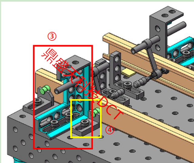 图中4所指黄色方框为非标定位角尺,用于定位及固定叉车框架上部件。