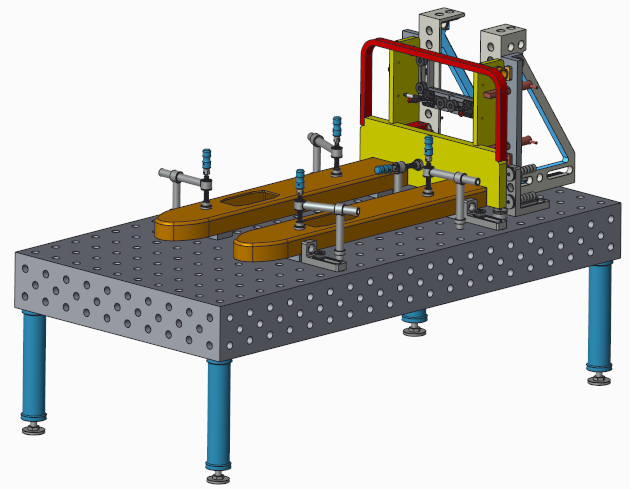 选用2400*1200*200mm的三维铸铁平台,450mm高支撑腿支撑,整体台面高度为650mm.柔性组合焊接工装可根据产品的结构不同,随时进行调整组装、调节方便,组装灵活。解决之前因结构不同而重复设计制作工装的问题。