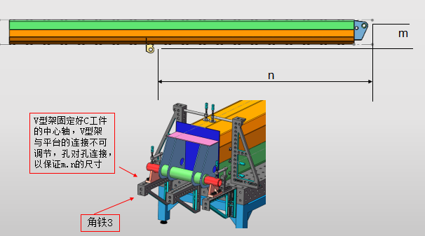 3.安装B工件与C工件一样的操作,采用V型架固定其中心轴位置,保证其m,n的尺寸,V型架的连接也采用孔对孔连接,固定不可调节,以防止其窜动,产生误差。