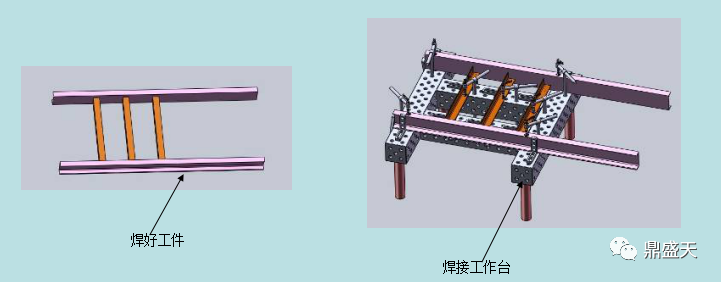 3、对斜架侧边架进行焊接,两侧边架共二个,但对称相同,利用主架同样的柔性夹具组装即可完成此工作。
