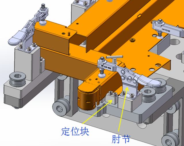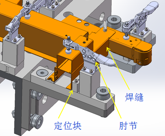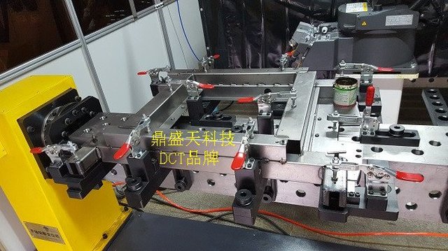 4. 根据产品的尺寸, 使用夹具合理地定位,控制焊接收缩量。根据产品的外形尺寸做定位块,限制X/Y方向。工件放置完后,肘节压紧。